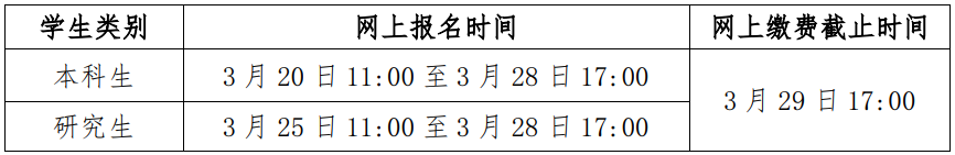 2024年上半年全国大学英语四、六级考试口试(以下称CET-SET)和笔试(以下称CET)将分别于5月18日至19日和6月15日举行,其中CET-SET于5月18日开考英语四级,5月19日开考英语六级;CET于6月15日上午开考英语(日语、德语、俄语、法语)四级,下午开考英语(日语、德语、俄语)六级。为确保我校报名工作顺利进行,现将有关事项通知如下: