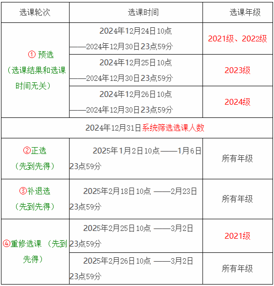 学校定于2024年12月24日启动2025年春季学期(2024-2025-2学期)选课工作,请同学们依据《本科培养方案》,参照2024-2025-2学期的《推荐课表》,结合自己的学习计划,在规定时间内完成选课。现将选课时间安排通知如下: