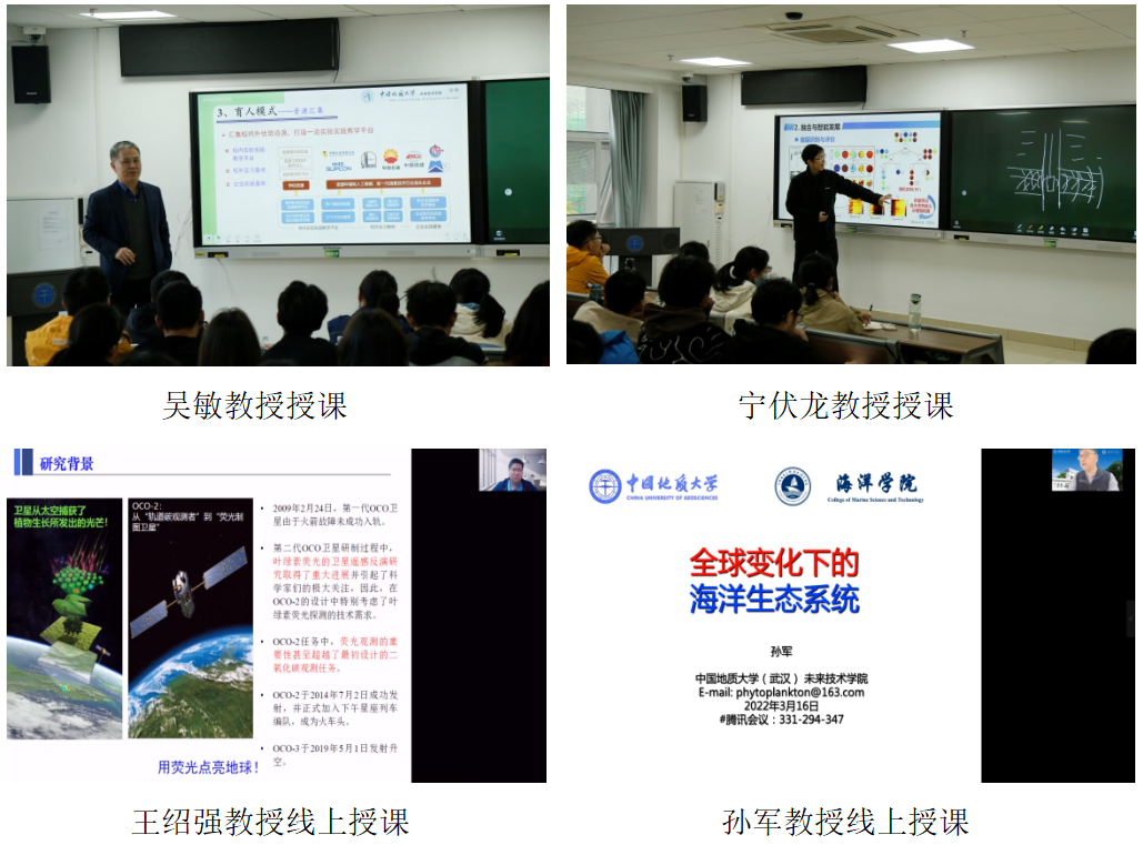 第五讲为计算机学院王力哲教授主讲的《未来技术与遥感》。王力哲教授首先介绍了过往出现的颠覆性科学技术,然后对数字地球和未来遥感技术特别是人工智能与遥感技术的融合进行了详细的讲解。第六讲为资源学院蒋恕教授主讲的《清洁地质能源勘探前沿导论》。蒋恕教授从清洁能源的定义、意义、类型及分布等几个方面对清洁地质能源进行了讲解,然后介绍了国内外清洁地质能源勘探技术的发展现状并对勘探技术未来的发展进行了展望。第七讲为校长王焰新院士主讲的《环境水科学前沿导论》。王焰新院士的授课围绕“水与可持续发展”、“水质与健康”、“可持续安全供水”三个主题展开,首先介绍了水之于地球生态系统和人类社会可持续发展的重要作用,然后举例说明了水质污染对人类健康的严重影响,最后讲解了在当前全球水污染严峻的形势下,如何利用科技创新实现可持续地安全供水。第八讲为地球科学学院谢树成院士主讲的《深时生物与环境演化前沿导论》。谢树成院士首先对研究地球科学需要用到的技术方法进行了总体介绍,然后讲解了团队针对微生物分子“低”、“杂”、“乱”、“源”的问题提出的创新性技术,最后讲解了地质微生物技术在地球科学重大问题中的应用。