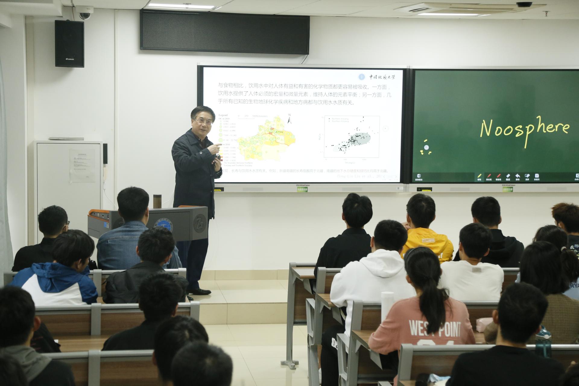 王焰新院士讲授《环境水科学前沿导论》。王焰新围绕“水与可持续发展”、“水质与健康”和“可持续安全供水”三个主题展开授课,通过深入浅出的知识分析以及现实生活案例,让学生们深刻理解水之于地球生态系统和人类社会可持续发展的重要作用。