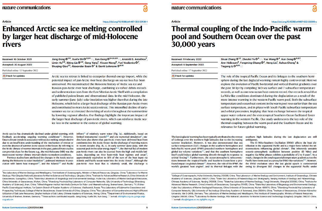 Dong, J., Shi, X.*, Gong, X.*, Astakhov, A.S., Hu, L., Liu, X., Yang, G., Wang, Y., Vasilenko, Y., Qiao, S. and Bosin, A., Enhanced Arctic sea ice melting controlled by larger heat discharge of mid-Holocene rivers. Nature Communications 13, 5368 (2022). (宫勋教授作为共同第一作兼共同通讯作者)