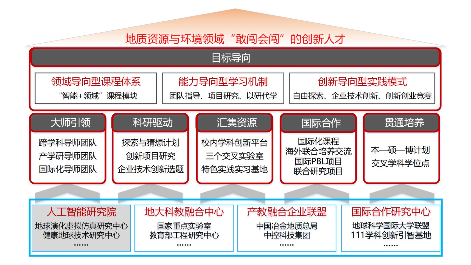 学院汇集学校在地质学、地质资源与地质工程、人工智能、新一代信息技术等领域的优势教学科研资源,打破传统理工专业设置的壁垒,以领域导向型课程体系、能力导向型学习机制、创新导向型实践模式三个创新为载体,以大师引领、科研驱动、资源汇集、国际合作和贯通培养五个维度为抓手,以人工智能研究院、地大科教融合中心、产教融合企业联盟、国际合作研究中心4个平台为基座,构建适应地质资源与环境领域“敢闯会闯”的创新人才培养新范式。
