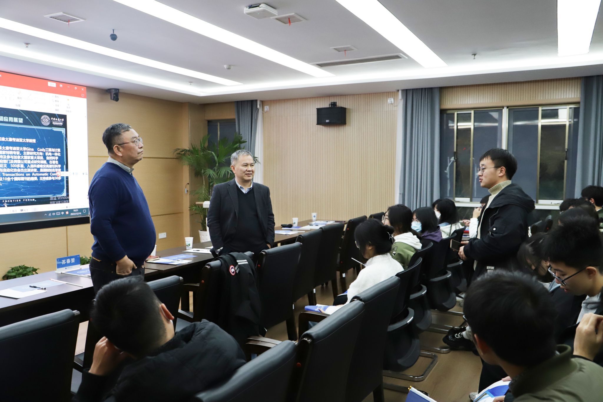 闭幕式结束后,加拿大康考迪亚大学苏春翌教授以《浅谈现代机器人的一些研究热点和应用展望》为题,为参会师生作了学科交叉前沿论坛的第六期报告。苏教授以阿特拉斯人型机器人、特斯拉“擎天”机器人等前沿热门成果为切入点,介绍了机器人的发展历史、学术定义、应用场景,并基于各种成果实例,讲解了柔性机器人技术、液态金属控制技术、脑机接口技术等最具前景的机器人研究热点,带领师生进行了一场难忘的“未来之旅”。报告结束后,苏教授与现场师生进行了热烈的交流讨论。