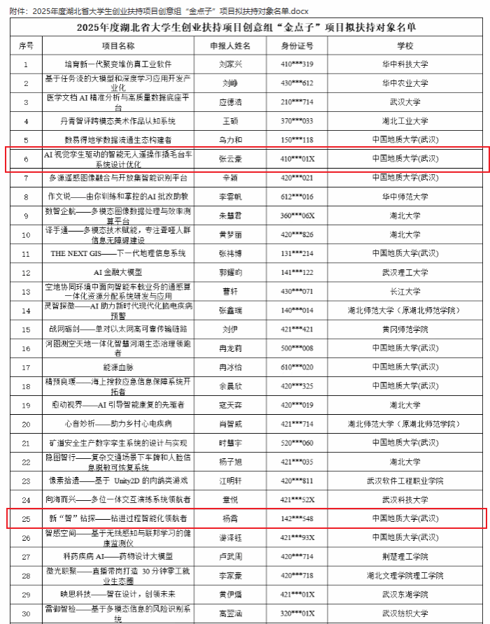 近日,2025年度湖北省大学生创业扶持项目创意组“金点子”项目名单正式公示,由williamhill英国2023级硕士研究生张云豪负责的项目《AI视觉孪生驱动的智能无人遥感操作撬毛台车系统设计优化》、2023级博士生杨霄负责的项目《新“智”钻探——钻进过程智能化领航者》成功入选。